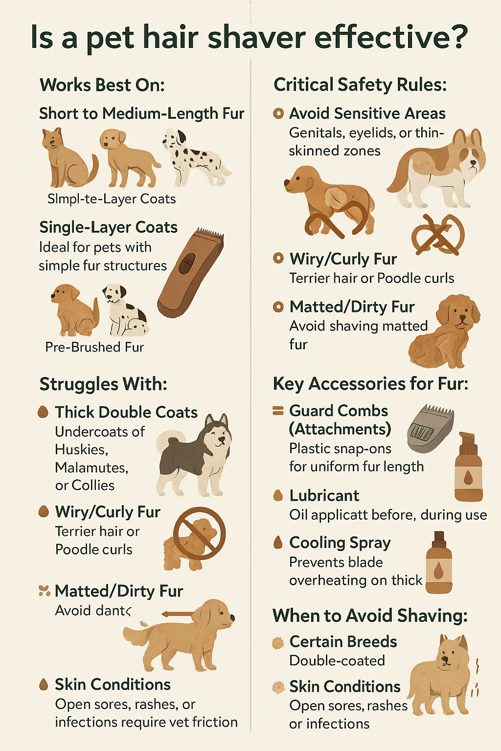Sì, a rasoio per capelli da compagnia (Chiamata anche CLIPPERS o TRIMMERS) è specificamente progettato per funzionare sulla pelliccia animale, ma l'efficacia dipende dal tipo di pelliccia, dalla qualità degli utensili e dalla tecnica. Di seguito è riportato una rottura dettagliata: