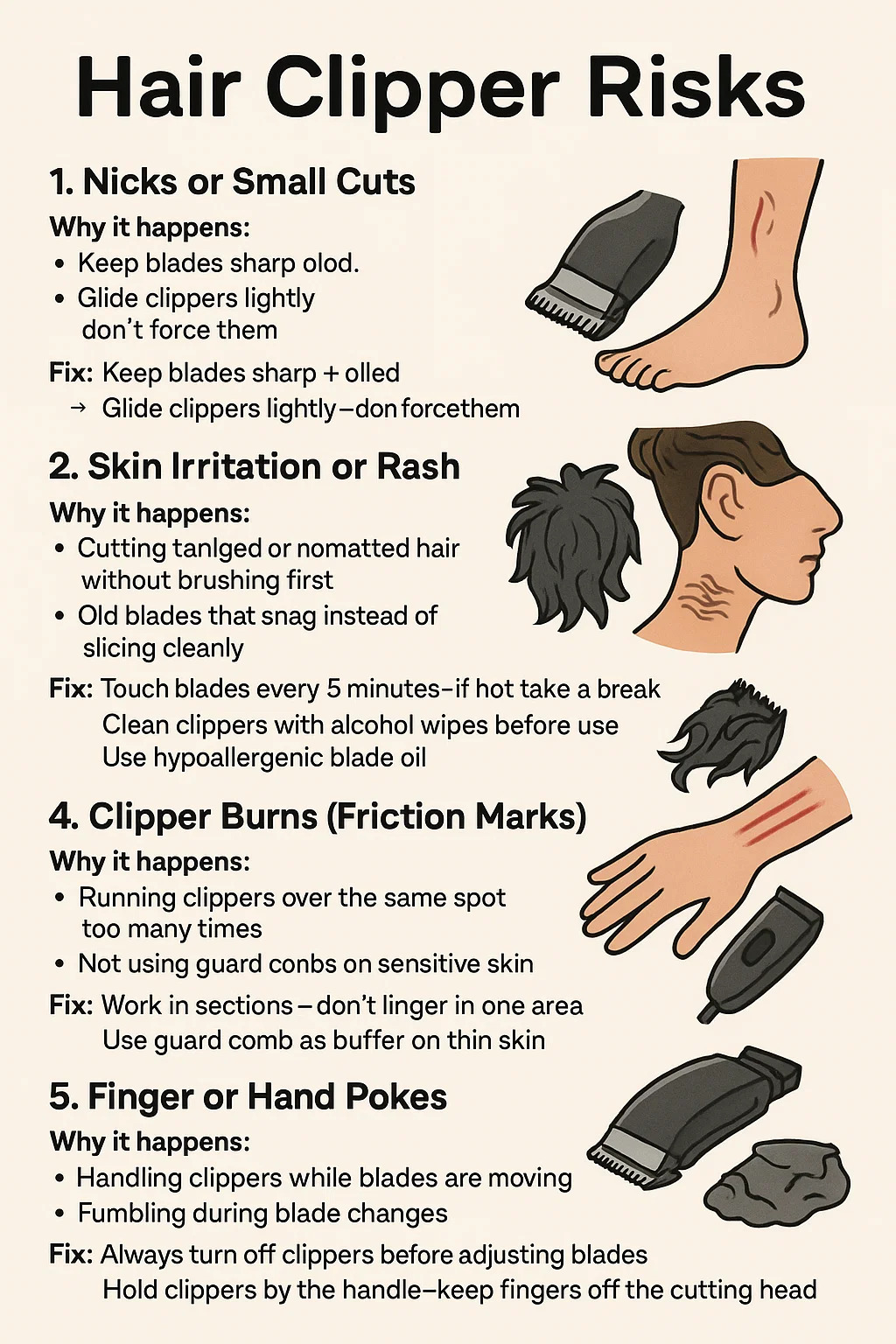 Utilizzo di tagliacapelli sporchi (peli intrappolati, olio vecchio, batteri).